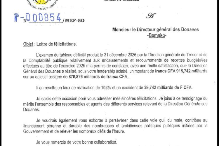 Lettre de félicitations du Ministre d’Etat SANOU à la Douane :
